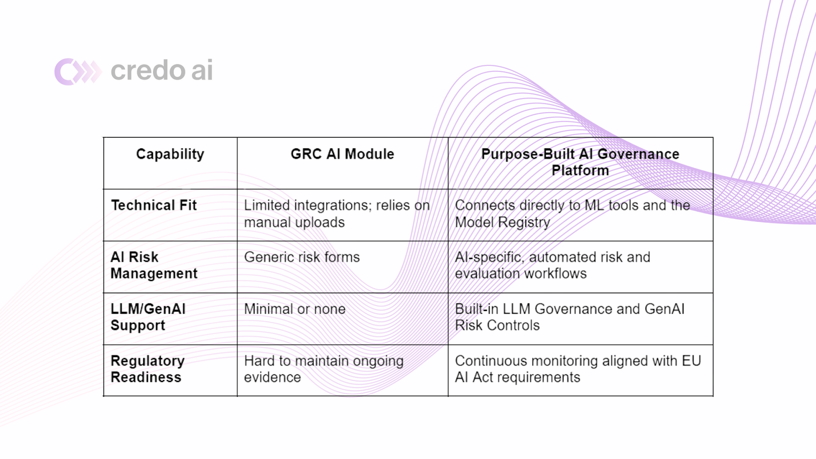 To make the distinction clearer, here are the differences that really matter when you compare a GRC module with a purpose-built AI governance platform: