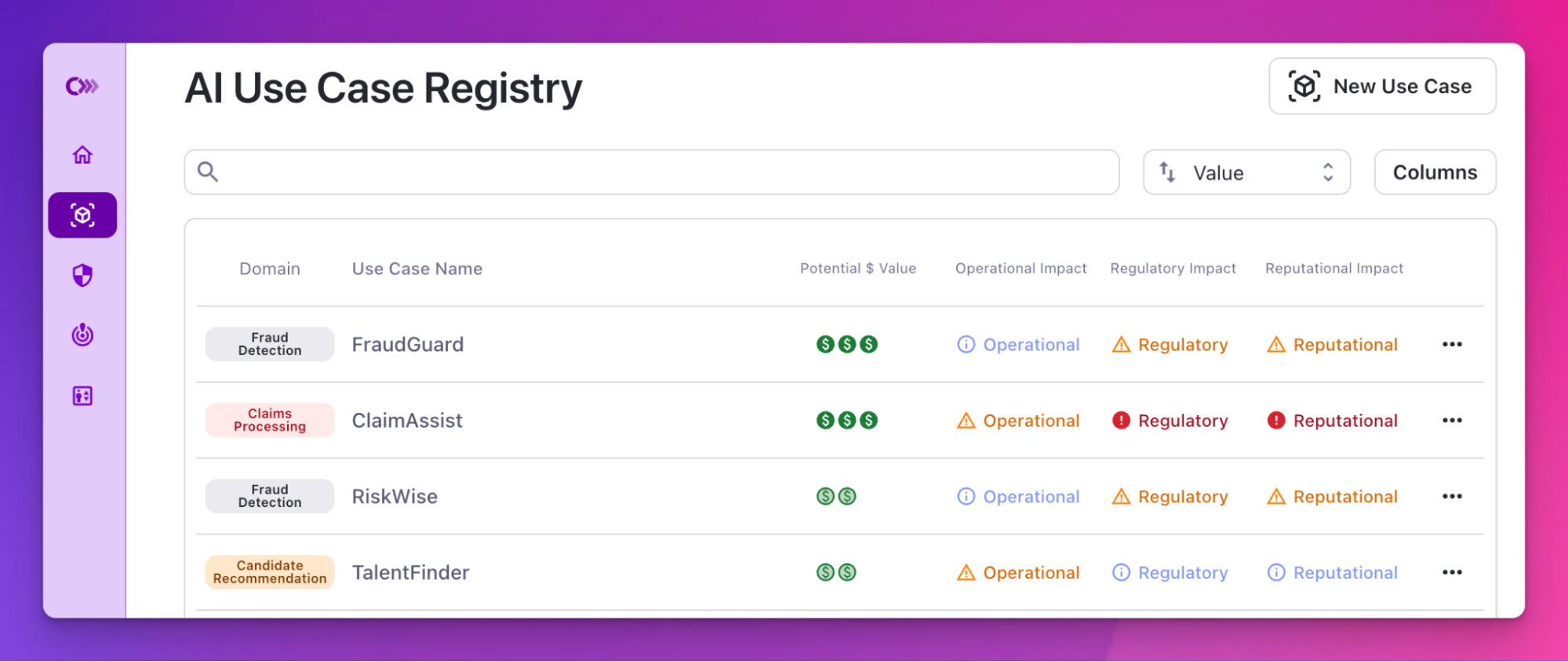 Imagine having a centralized library for all your AI projects, where you can quickly sort projects by value or impact and risk to your business.